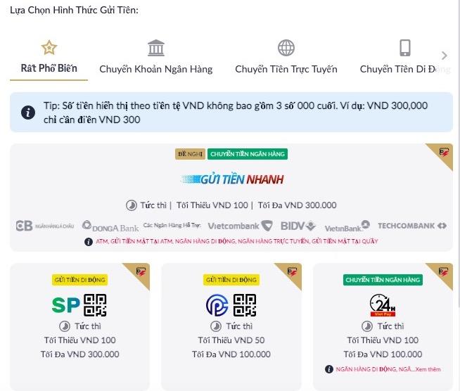 | Thời gian nạp tiền | Từ 5-10 phút |